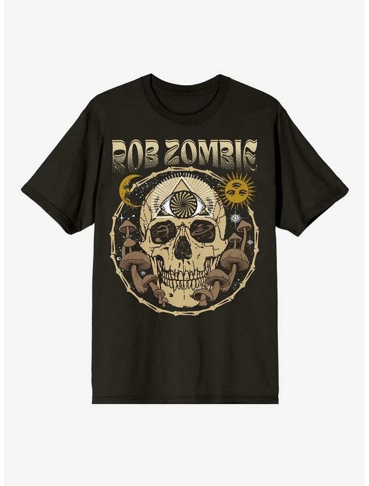 Add more Rob Zombie tees to your collection with this black one featuring a mushroom-accented skull graphic and his name above.