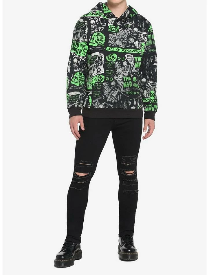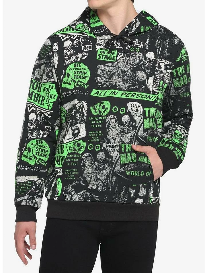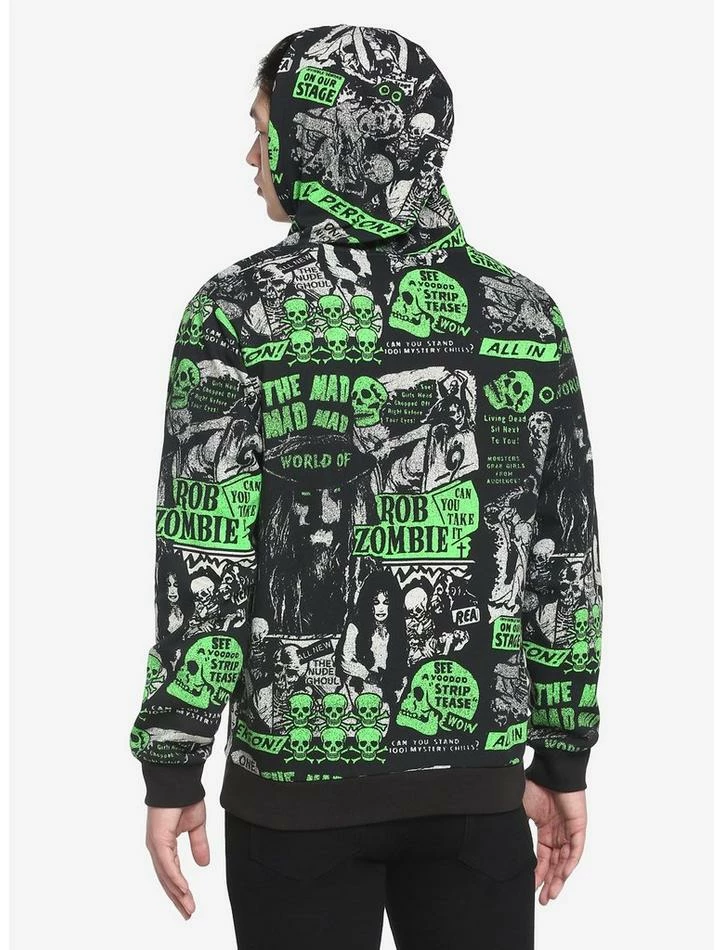 Never say no to more Rob Zombie merch! This hoodie features an allover white and green collage of Rob Zombie-inspired graphics.ย