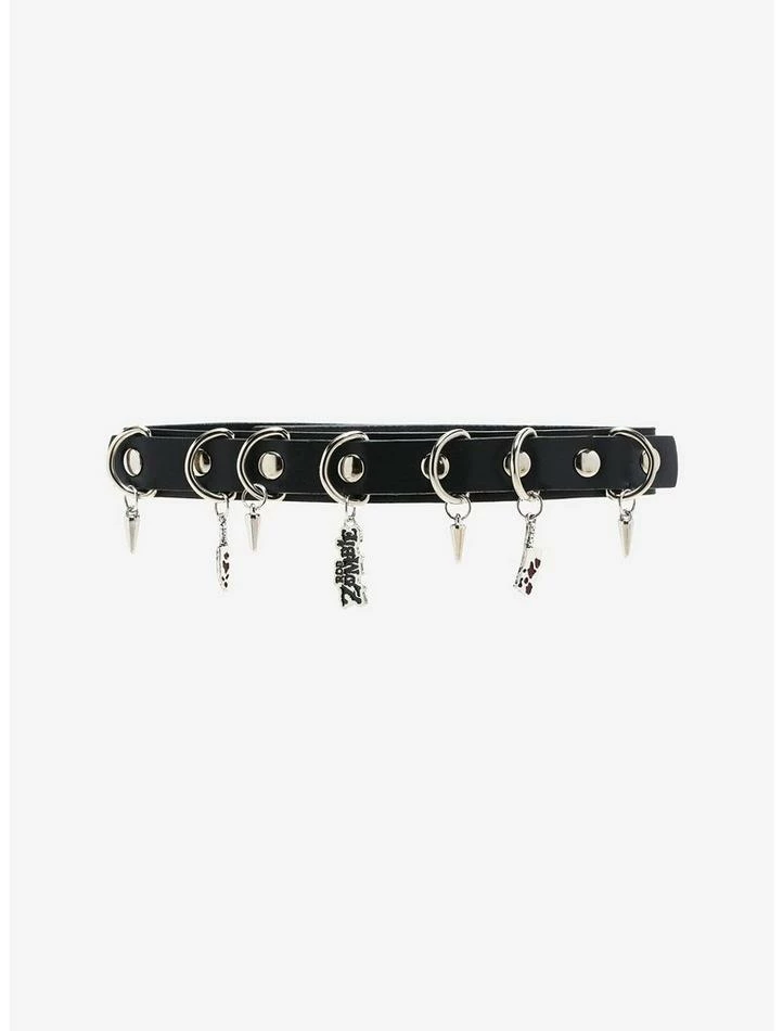 Complete your concert ‘fit with a statement piece! This Rob Zombie choker features bloody weapon and spike charms attached to D-rings. Complete with a snap-button closure.