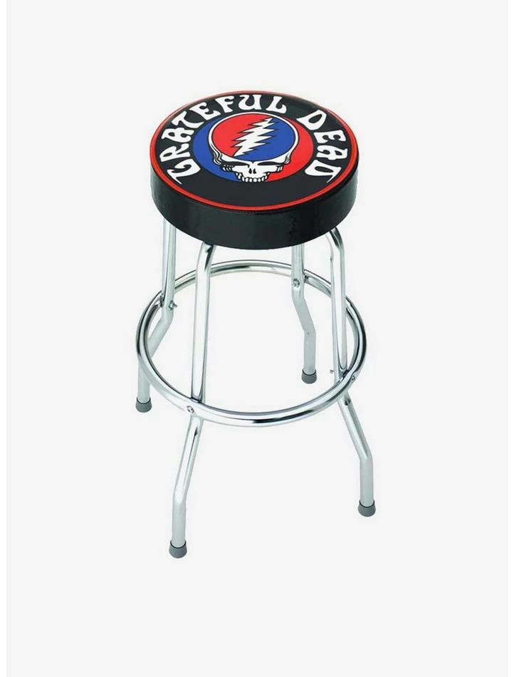 Check out this cool Grateful Dead Bar Stool. Each stool features a PVC coated sponge seat swivel top and chrome plated legs. Each stool is 30″ tall and the seat is 14″ wide. The max weight is 300 lbs. – perfect for your home bar! Assembly required.