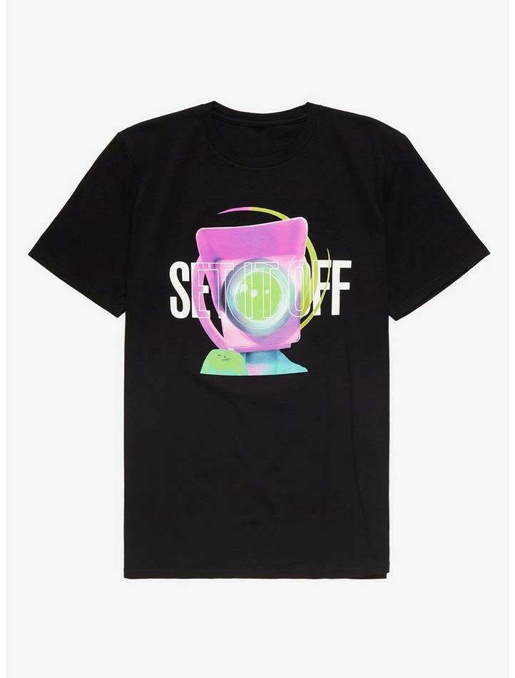 Excited for Set It Off’s Welcome to Elsewhere tour? In honor of their album Elsewhere (2022), this design features the band’s name overlaid on a projector head character inspired by the song.