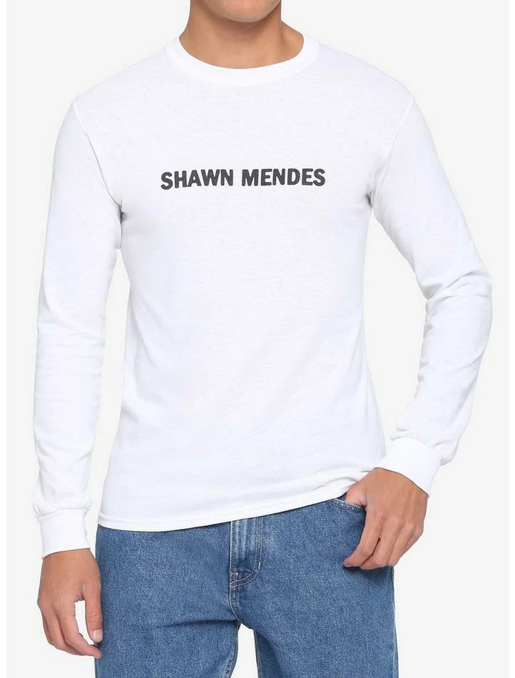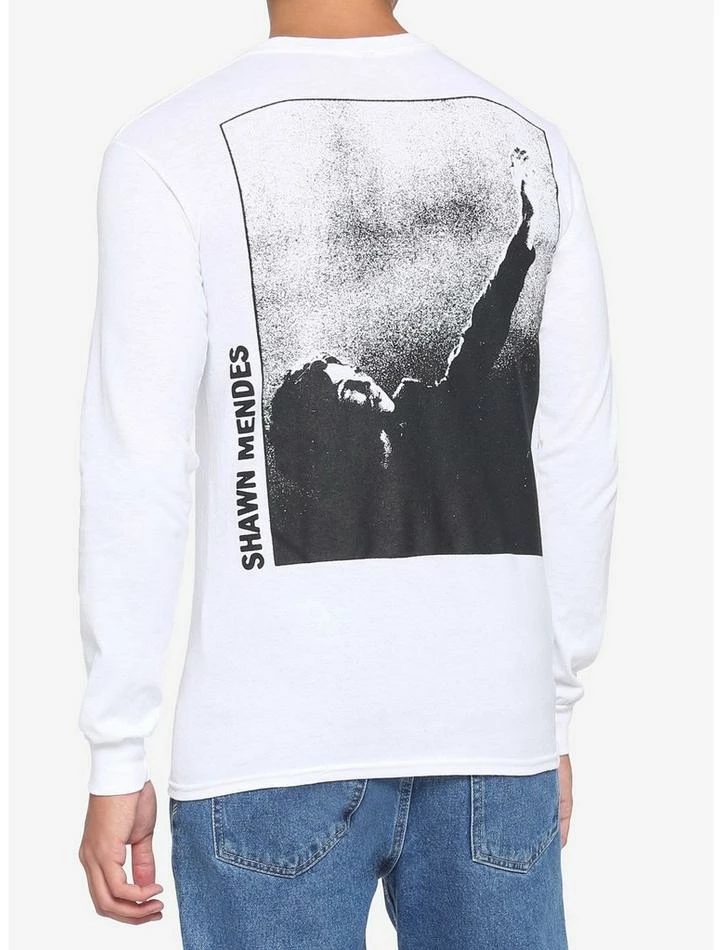 Love Shawn Mendes? So do we! This white long-sleeved T-shirt features the artist’s name in plain black text on the chest and a stippled, high-contrast black image of Mendes across the back.
