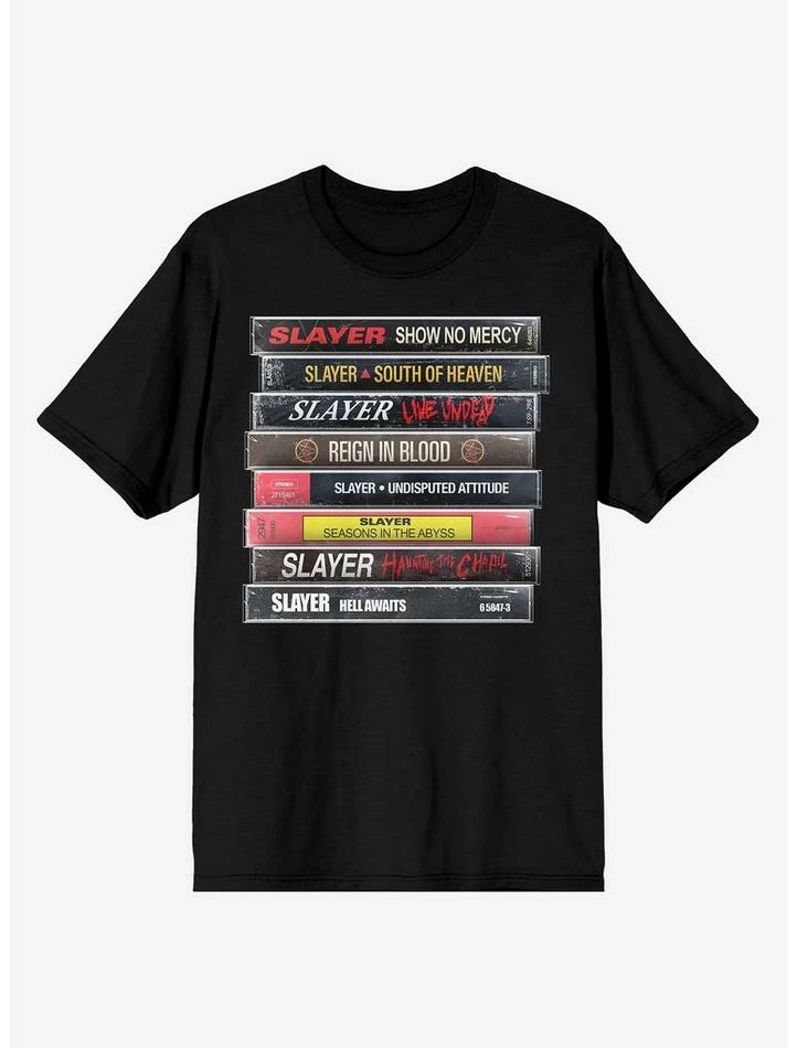 There’s just something about having to rewind a tape. Feel nostalgic with this Slayer tee, featuring a stack of their album cassette tapes.