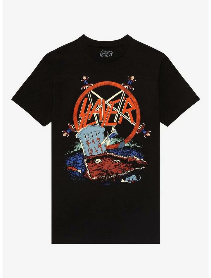 Rest In Peace? More like Reign In Pain. This Slayer tee shows a grave with a vandalized tombstone, and the band’s iconic pentagram logo in the background.