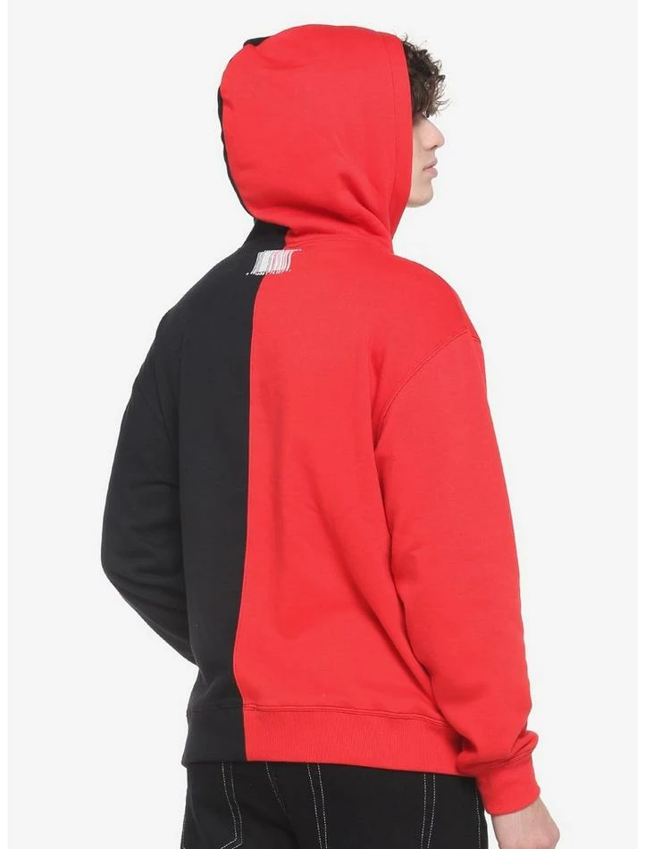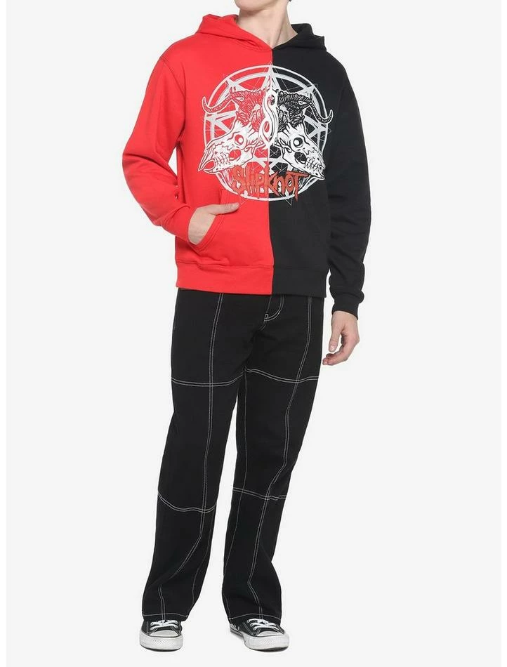 If regular hoodies are not your kind, try this split Slipknot style. It features a black and red split design, with a large graphic of goat skulls and the Slipknot band logo, with a barcode at the back of the neck. Drawstring hood and front kangaroo pockets.