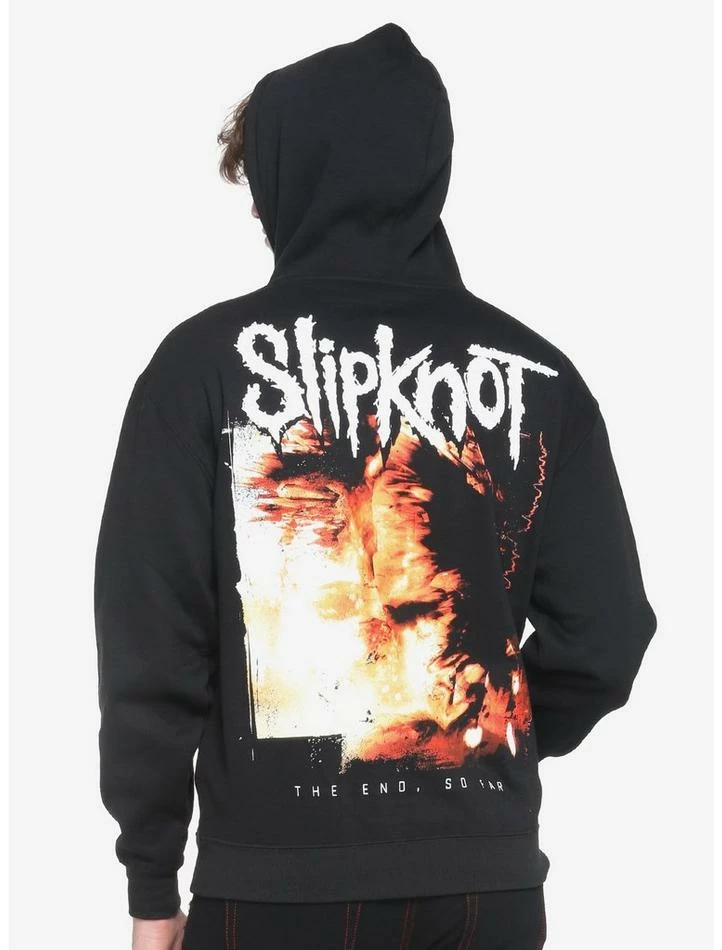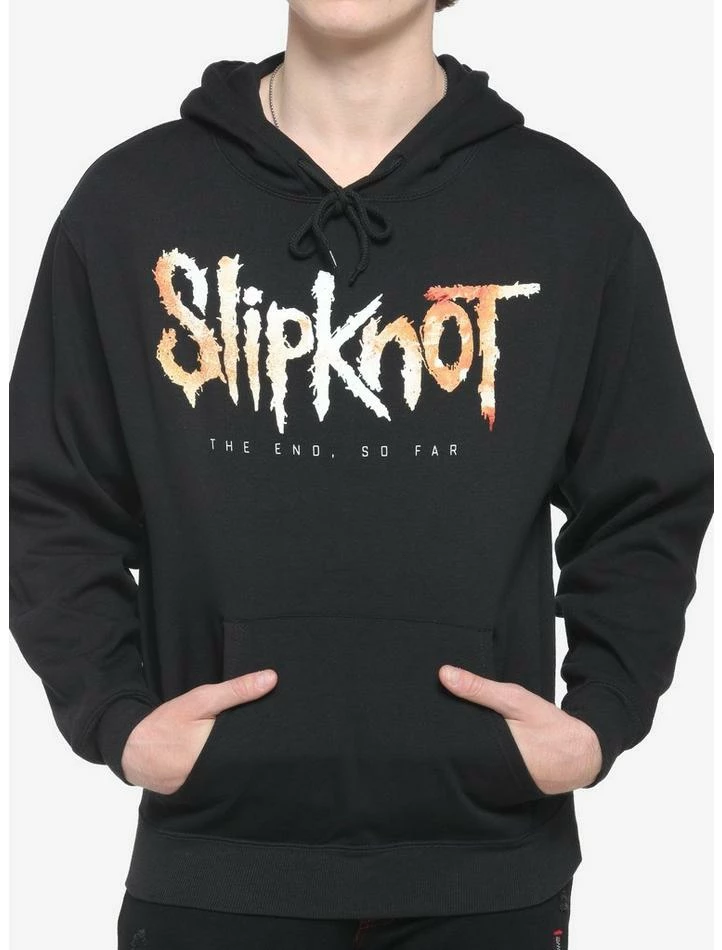 Have you been excited for Slipknotβs new album The End, So Far since the band debuted “Chapeltown Rag” live at Knotfest in November 2021? Us, too. Get a head start on your merch collection with this hoodie celebrating the latest LP, with the band logo and LP name on the front, and a large graphic inspired by the album cover on the back. Front kangaroo pockets and drawstring hood.