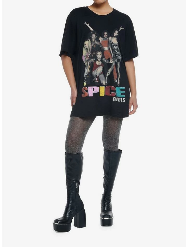 Spice up your life and wardrobe with this black tee dress featuring a group image of the Spice Girls with logo.