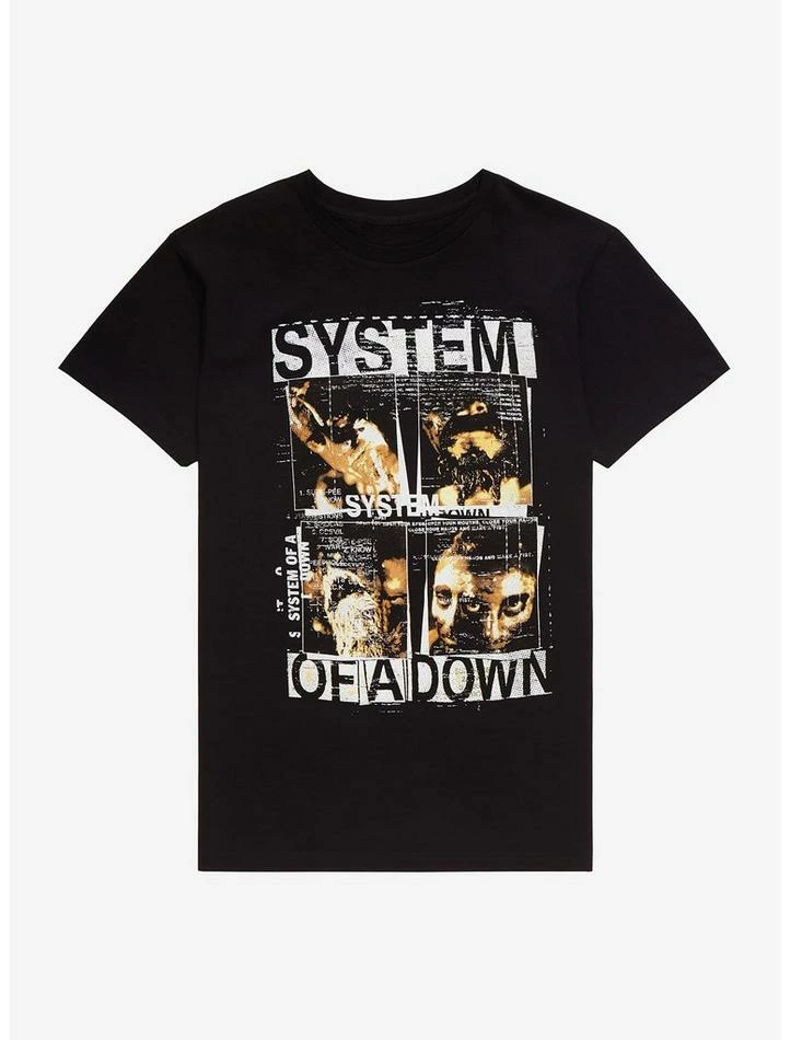 Gonzo nu metal giants System Of A Down will never cease ruling. Grab a new SoaD tee for your collection. This one features a a grid of stylized photos and collage style text of the band’s name.