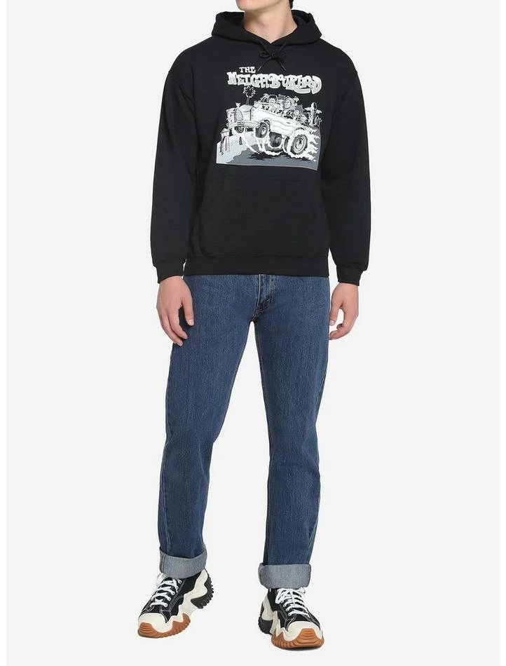 Feelin’ a little chilly? Looks like sweater weather is upon us! Keep warm in this The Neighbourhood hoodie! Featuring a cartoon-inspired illustration of the band driving along the beach, with their text logo above and “Too cold” as the car’s license plate. Complete with a drawstring hood and kangaroo pocket.