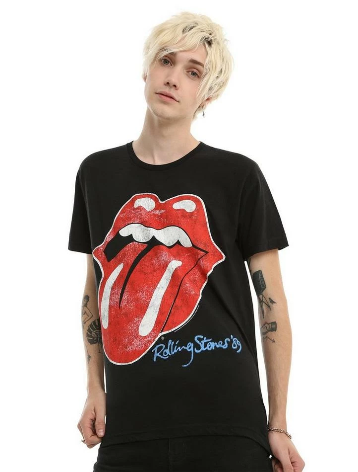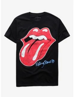 Black T-shirt from the Rolling Stones with a faded & distressed design featuring their iconic tongue logo and text that reads “Rolling Stones ’89.”