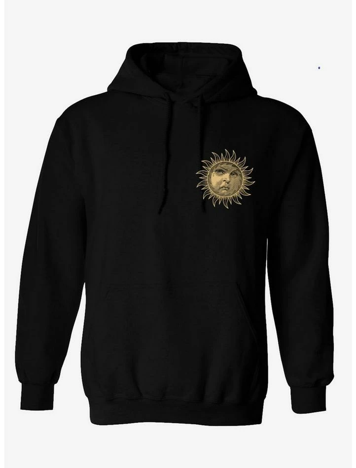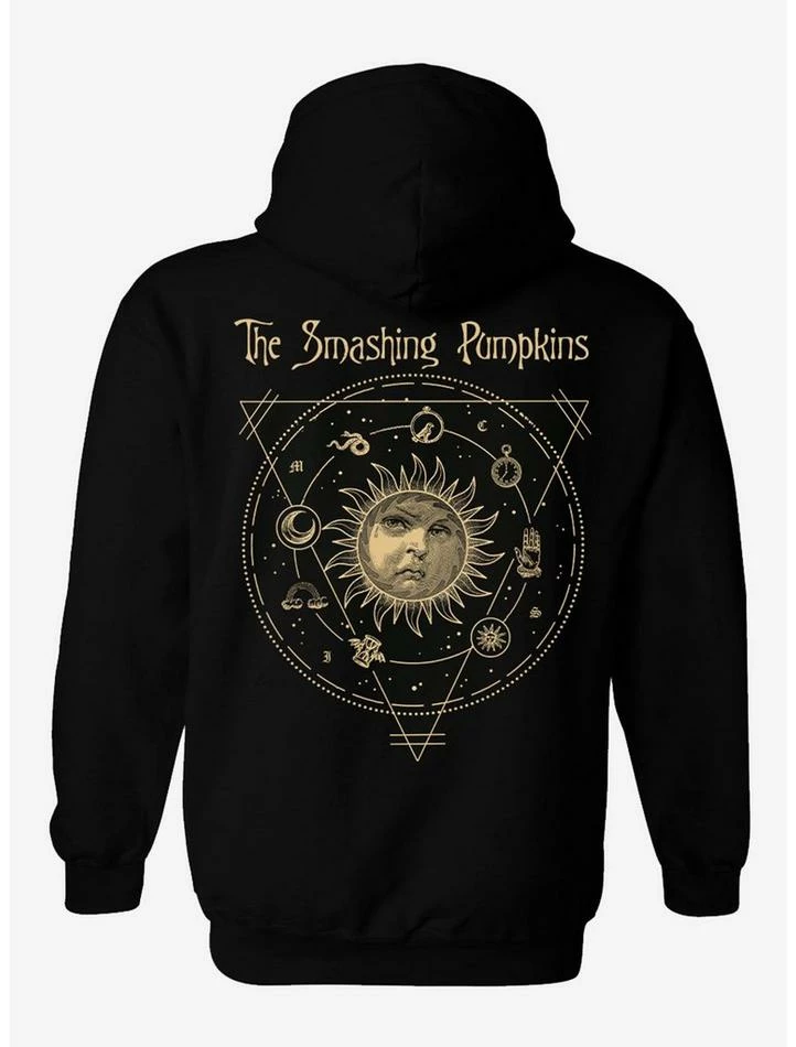 Rep your love for The Smashing Pumpkins in colder temps with this cozy hoodie! Featuring a sun with a face graphic at the chest, and a whimsical icon chart on the back with the band’s name up top. Comes with a kangaroo pocket and a drawstring hood.