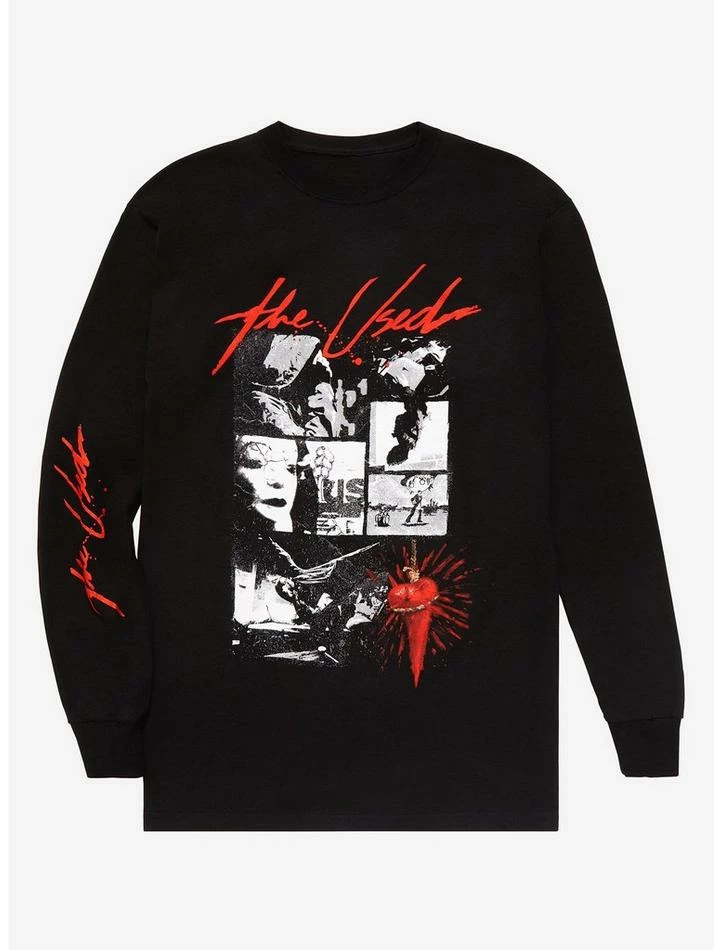No need to pick a favorite album, rep them all on this black long-sleeve tee featuring a collage of album covers from The Used with red logo on the right sleeve.