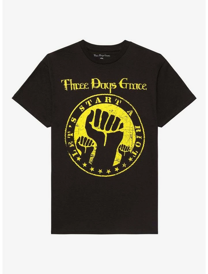 Ready to start a riot? You’ll need a tee for the occasion. This Three Days Grace style is inspired by the 2006 track “Riot” off One-X, showing fists and the chorus line.