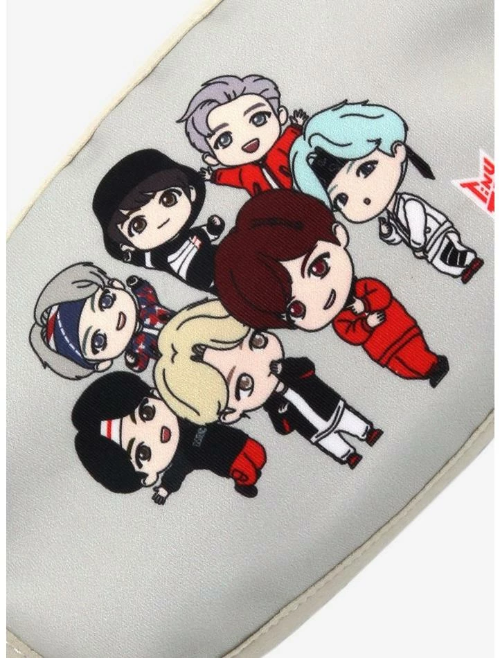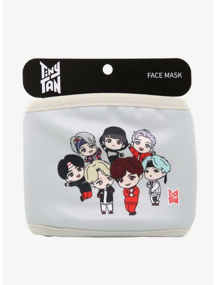 Add more looks to your TinyTAN collection with this grey fashion face mask. Inspired by BTS and “MIC Drop,” it has a group design with the characters ready to dance. Elastic straps.