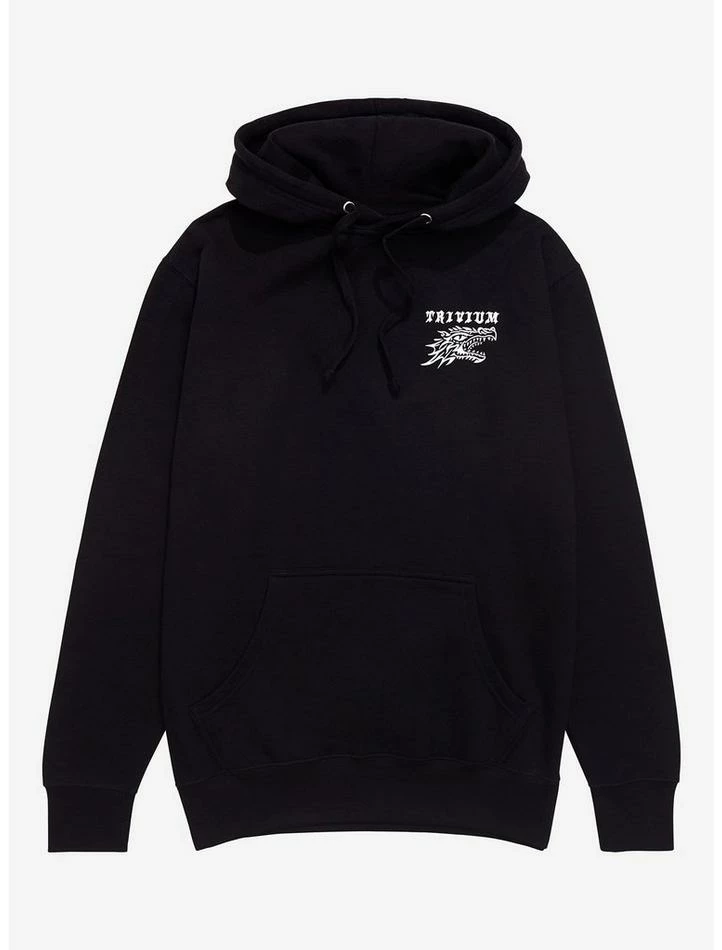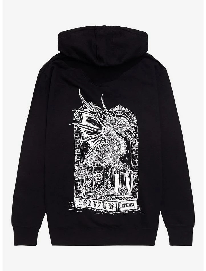 In the clash between band hoodies, this Trivium one is sure to come out on top. Inspired by the band’s latest LP In the Court of the Dragon, its front graphic shows a medieval drawing of a dragon and the band’s text logo. The shows a large graphic of a fire-breathing dragon standing atop a pedestal draped with tapestries and flags. Drawstring hood and front kangaroo pocket.