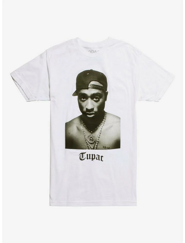 All eyez will be on you in this new Tupac tee. Featuring a black-and-white photo of him with his name underneath printed on the front of this white shirt.
