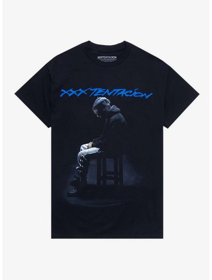 Honor XXXTentacion with this tee featuring a portrait of the rapper sitting on a stool, with his text logo above.