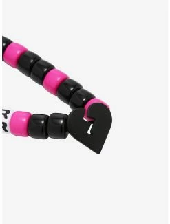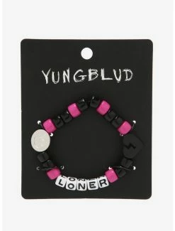 Don’t wreck your brain over how to accessorize your outfit, YUNGBLUD has you covered! This beaded bracelet is full of magenta and black beads throughout, with “Loner” spelled out in block letters, charms with YUNGBLUD’s signature smile face with X-ed out eyes and a broken heart charm.